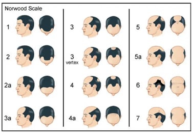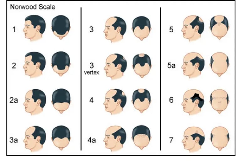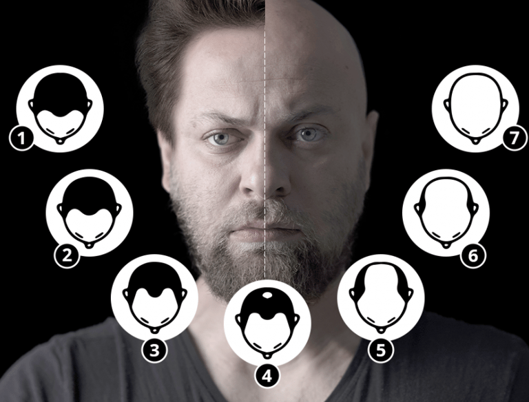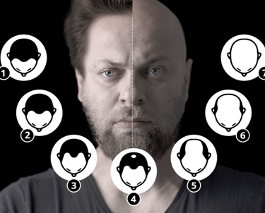 Les chiffres sont éloquents : selon la Société française de dermatologie, 30 % des hommes présentent une calvitie à 30 ans, 50 % à 50 ans et 80 % à 70 ans. Si certains l’assument, pour d’autres c’est un véritable calvaire souvent à l’origine d’un mal-être et d’une perte de confiance en soi. Et malheureusement, autant l’annoncer d’emblée, il n’existe aucun traitement efficace (au sens guérison). La seule solution pérenne consiste en une greffe capillaire. Mais pour bénéficier d’une greffe de cheveux, encore faut-il qu’il vous reste quelques cheveux. Il est donc important d’établir un diagnostic le plus tôt possible. Et pour ce faire, l’outil de référence est l’échelle de Norwood-Hamilton (Schématisé ci-dessus en 7 stades)