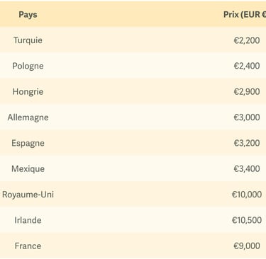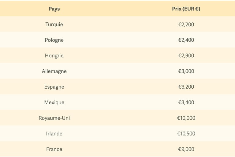 Vous trouverez ci-dessous une liste de prix moyens dans différents pays, qui correspondent à une greffe de 2000 implants capillaires grâce à la méthode DHI, dans une clinique de haut standing. Attention, ces prix sont donnés à titre indicatif et ne peuvent être garantis, car le coût final d'un traitement dépend de divers facteurs.